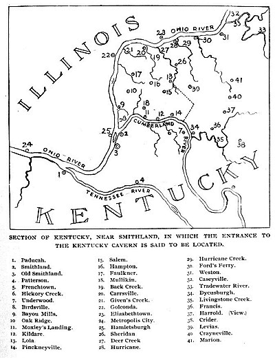Я был глубоко впечатлён меняющимися красотами этого необычного пейзажа Кентукки. Однако, я удивлялся тому, что по мере того как я становился весёлым и полным энтузиазма, мой гид соответственно становился унылым и мрачным. Время от времени он впадал в задумчивость, и однажды я поймал его взгляд, направленный на меня так, что я подумал, будто он выражает сожаление или зависть. Мы прошли по отвесному берегу Бисвела и оставили реку Кумберленд и её верхней конечности, в которую вливался другой приток. Отсюда мы пересекли местность после того, как поднялись на некоторую высоту по этому притоку, обнаружив её холмистой и плодородной, с полянами, разбросанными то там, то сям. Во время путешествия мы то разбивали палатку на ночлег, то останавливались у поселенца, которого ещё нужно было найти в той редконаселённой местности. Иногда между приёмами пищи были раздражающие промежутки времени, но мы не страдали, так как несли с собой запасы пищи - сыр и бисквиты, купленные в Смитленде на всякий случай. Так что мы прошли внушительное расстояние в графство Ливингстон, штат Кентукки. Я наблюдал удивительные стоки на земле, иногда конусообразные, затем снова отвесные. Эти впадины время от времени были значительных размеров и глубины, их было намного больше в верховьях, чем в низинах. Они были немного похожи на нечто, напоминающее сточные сливные отверстия в штате Нью-Йорк, но чудовищны в сравнении. Первая впадина, которая привлекла моё внимание, находилась возле реки Кумберленд, как раз перед холмом Бисвела. Она была около сорока футов глубиной и тридцати в диаметре, с крутыми каменными сторонами, внутри которых росли кустарниковые растения на необычных местах там, где собиралась рыхлая почва на выступах камня, что неожиданно появлялось вдоль неровных поверхностей. Дно углубления было плоское и плодородное, покрытое роскошной растительностью. На одной стороне основания этой гигантской вазы пещера уходила внутрь земли. Я стоял у края этого воронкообразного углубления и восхищался его необыкновенным видом. Дух любознательности, что часто действует на людей, когда появляется необычный пейзаж, овладел мною. Я спустился вниз, извиваясь от куста к кусту, и ступая по скалистым выступам, пока не достиг дна полости. Положив руку на чёрное отверстие в её центре, я почувствовал поток холодного воздуха, идущего снизу вверх. Я попробовал воткнуть туда длинную палку, но направление в отверстии было извилистым, что не позволяло мне провести исследование подобным образом. Я бросил в отверстие крупный камень. Он вращался и падал с лязгом вниз и вниз, пока, наконец, звук не исчез. "Я бы хотел пройти внутрь полости, так же как и этот камень, и найти секрет этой пещеры" - подумал я, и мною овладела страсть к исследованиям, что вероятно бывает с большинством людей. Мой спутник, сидевший на выступе каменной стены, ответил сверху на мои мысли: "Ваше желание будет вознаграждено. Вы попросили о том, что уже лежит перед Вами. Вы будете там, где побывали немногие до Вас, и у Вас будет привилегия следовать в сферу природных чудес. Плодородное поле исследования ждёт Вас, такое, что превосходит Ваши самые смелые фантазии. Идите сюда и садитесь возле меня, ибо в моей обязанности сейчас сказать Вам нечто о той земле, к которой мы приближаемся - пещерных местах Кентукки". |